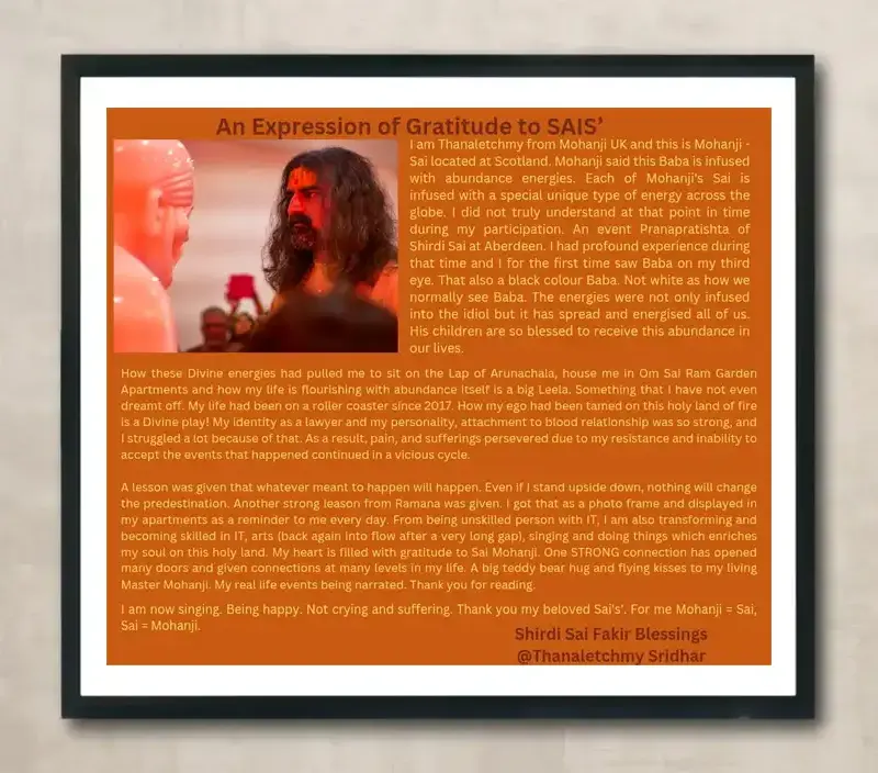 My personal journey is the testament as to how and where I was in my life in the year 2022 and where I am at present in the year 2025. How I have evolved, transformed and shifted in my life from the UK to Tiruvannamalai, India! It is not merely a geographical shift but a big shift in my life has occurred and I owed it to the Father (Shirdi Sai Baba) and Son (Mohanji). I accept and see them as “oneness” and they are my “SAIS”. One Sai in “subtle body” and another Sai in physical body. A more detailed insight will be shared when time permits. Each participant’s experience is unique and therefore, it is important that one does not engage in the meditation process with any kind of expectations.